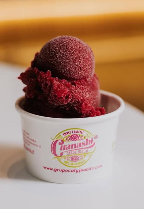 Son elaboradas a base de agua, mezcal oaxaqueño, leche o crema natural, además tiene grandes trozos de fruta o frutos secos que le aportan un exquisito sabor y se sirven en forma de bola sobre un vaso o cono de galleta.